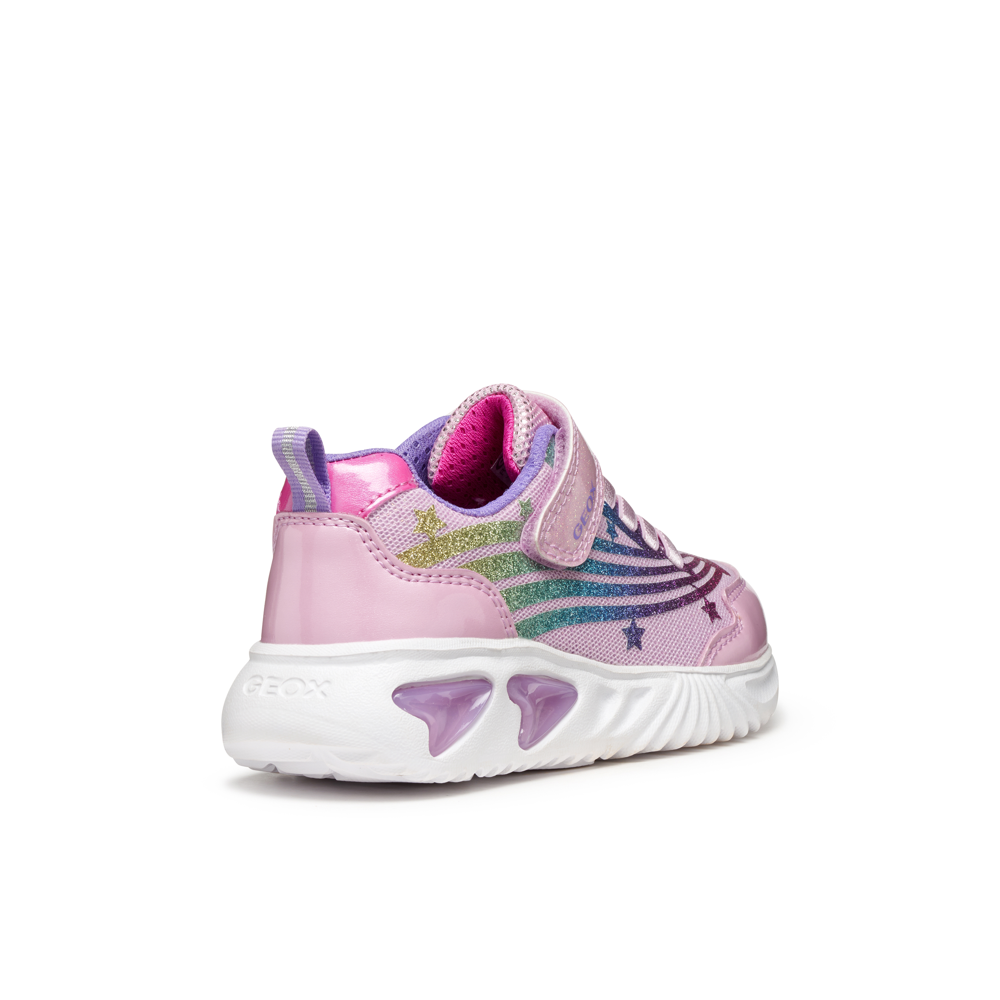 Sneaker for girls with a feisty modern design that exudes active energy and will inject their everyday looks with characterful charm. This version in pink has been crafted from a shiny fabric and pearlescent leather-effect material with patent detailing and multi-coloured accents that are bound to garner attention. Assister boasts twinkling lights built into the sole, bringing fun and energy to their every step and making it an ideal solution for schooldays and playtime alike.
