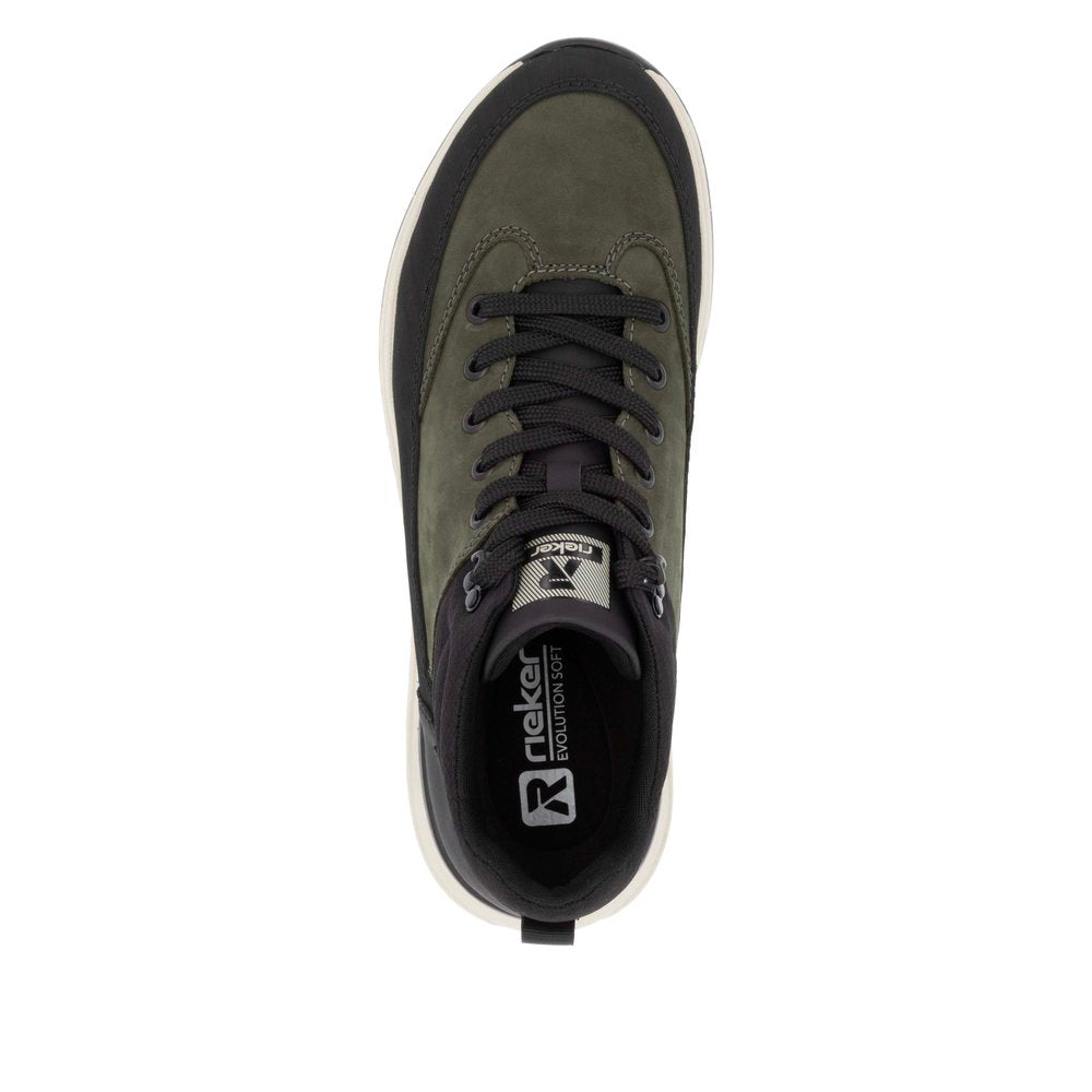 These green black Rieker lace-up boots are made of quality synthetic leather. Walk Protected with the water-repellent, breathable RiekerTEX membrane. The HighTech Nano coating provides a water and dirt-repelling effect. Padded, removable insole with cushioning properties. Light Drysport lining with breathable properties.