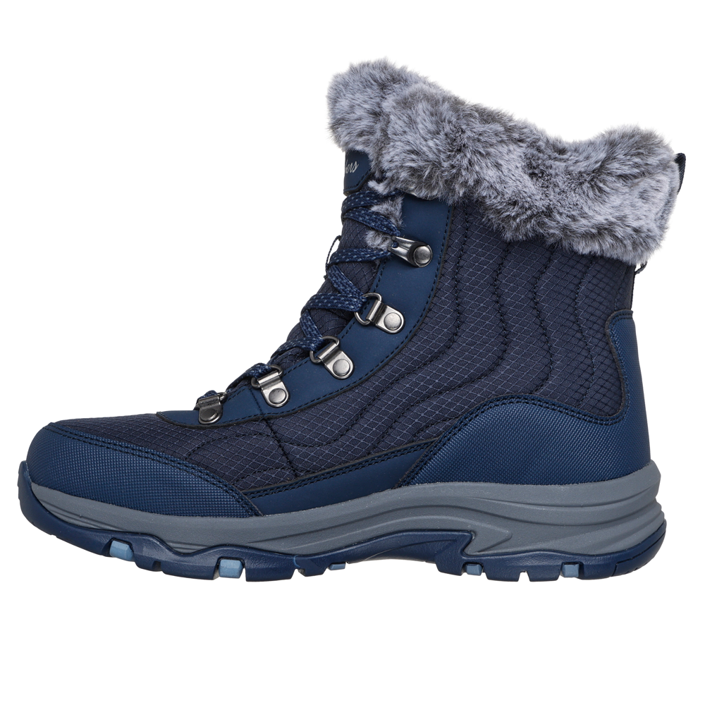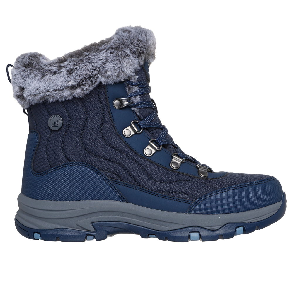 Take the winter on in stylish comfort with Skechers Relaxed Fit®: Trego - Stormie. This waterproof winter trail boot features a roomy quilted fabric and synthetic upper with a lace-up front, faux fur collar and lining, plus a cushioned Skechers Memory Foam™ insole.